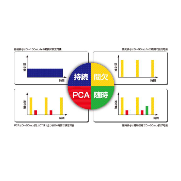 4つの投与モード(持続、間欠、PCA、随時)を搭載し、それらを自由に組み合わせることができます。