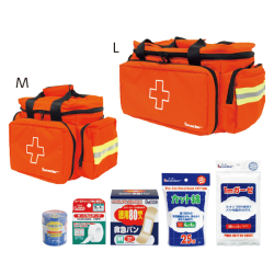 ・Mサイズセット内容/リーダーカット綿25g(4cm×4cm)、リーダーガーゼ(30cm×1m)、エルモサージカルテープ12.5mm×9m、ププレ伸縮包帯M5cm×4.5m、エルモキズ洗浄液80mL、エルモ手指・皮膚の洗浄消毒スプレー83mL、エルモ救急バンM×80枚、リーダー衛生ピンセット