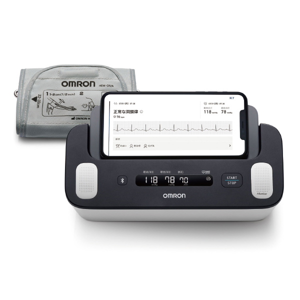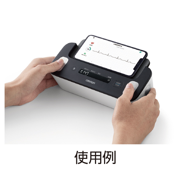 ・1台で血圧測定と心電図の記録ができる商品。心電図の記録には、対応するスマートフォンとスマートフォンアプリ「OMRON connect」(無料)のインストールが必要です。