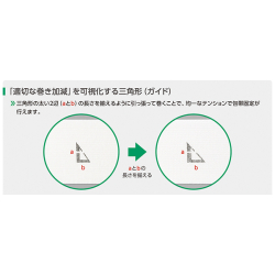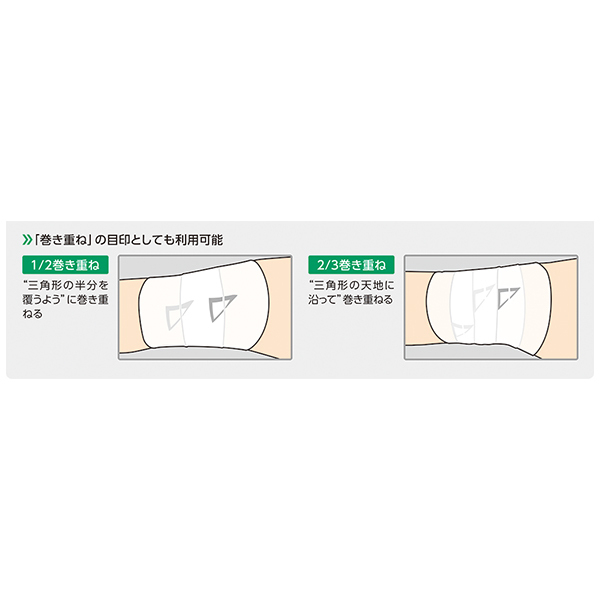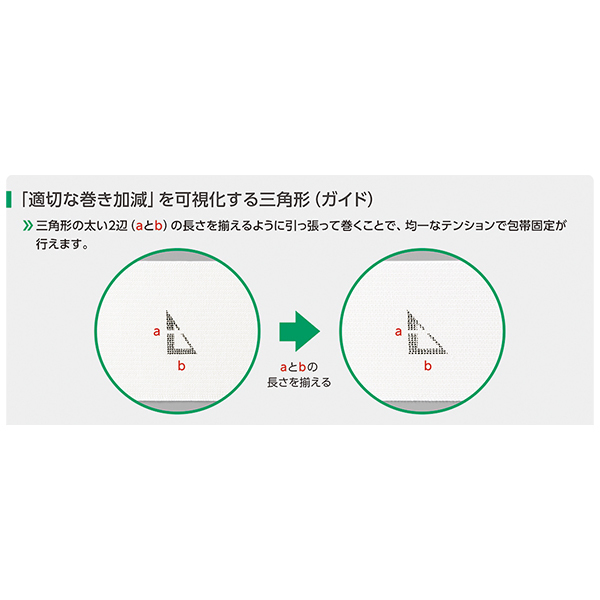 ・三角形の太い2辺(aとb)の長さを揃えるように引っ張って巻くことで、均一なテンションで包帯固定が行え、「巻き重ね」の目的としても利用可能です。